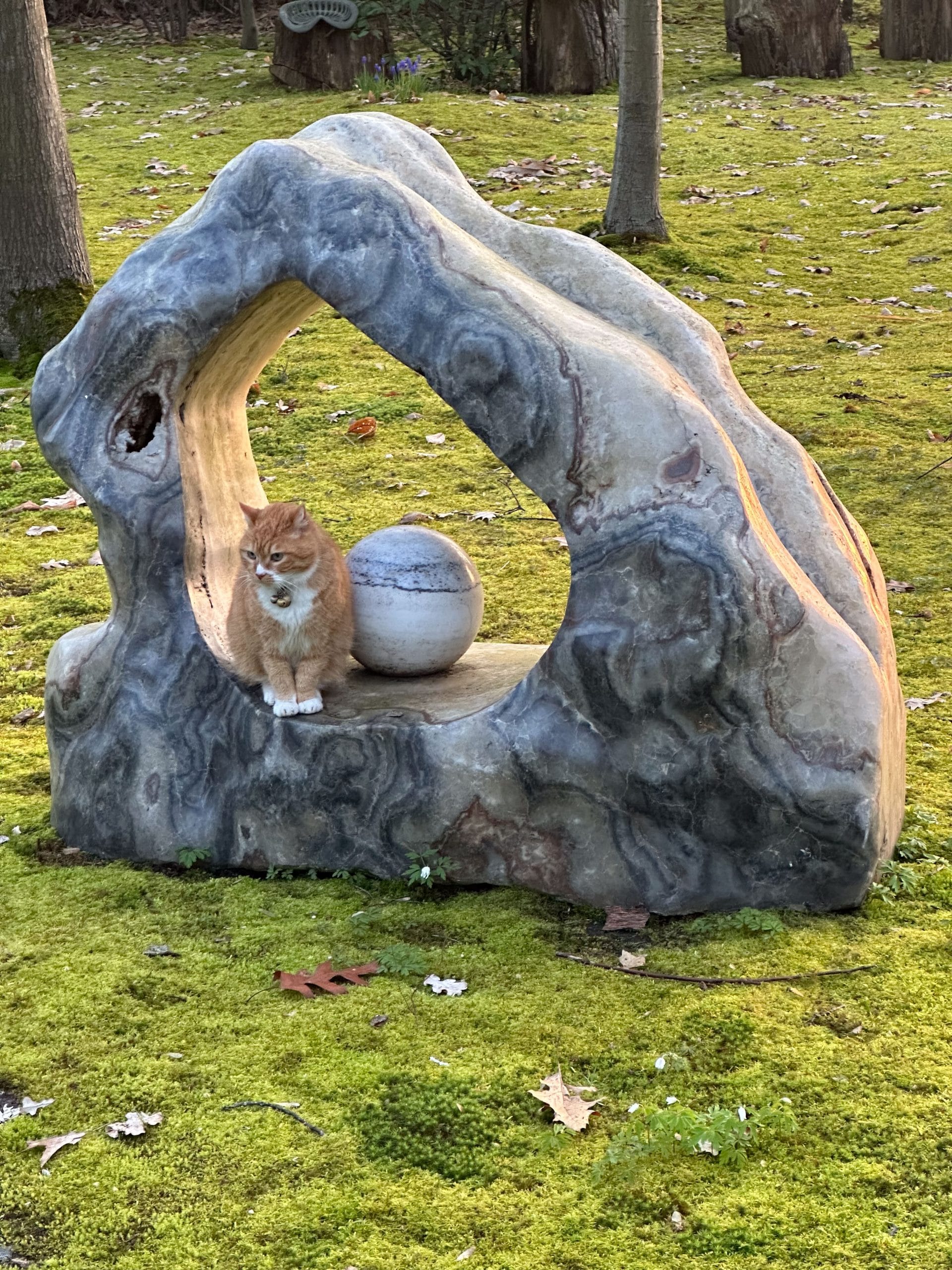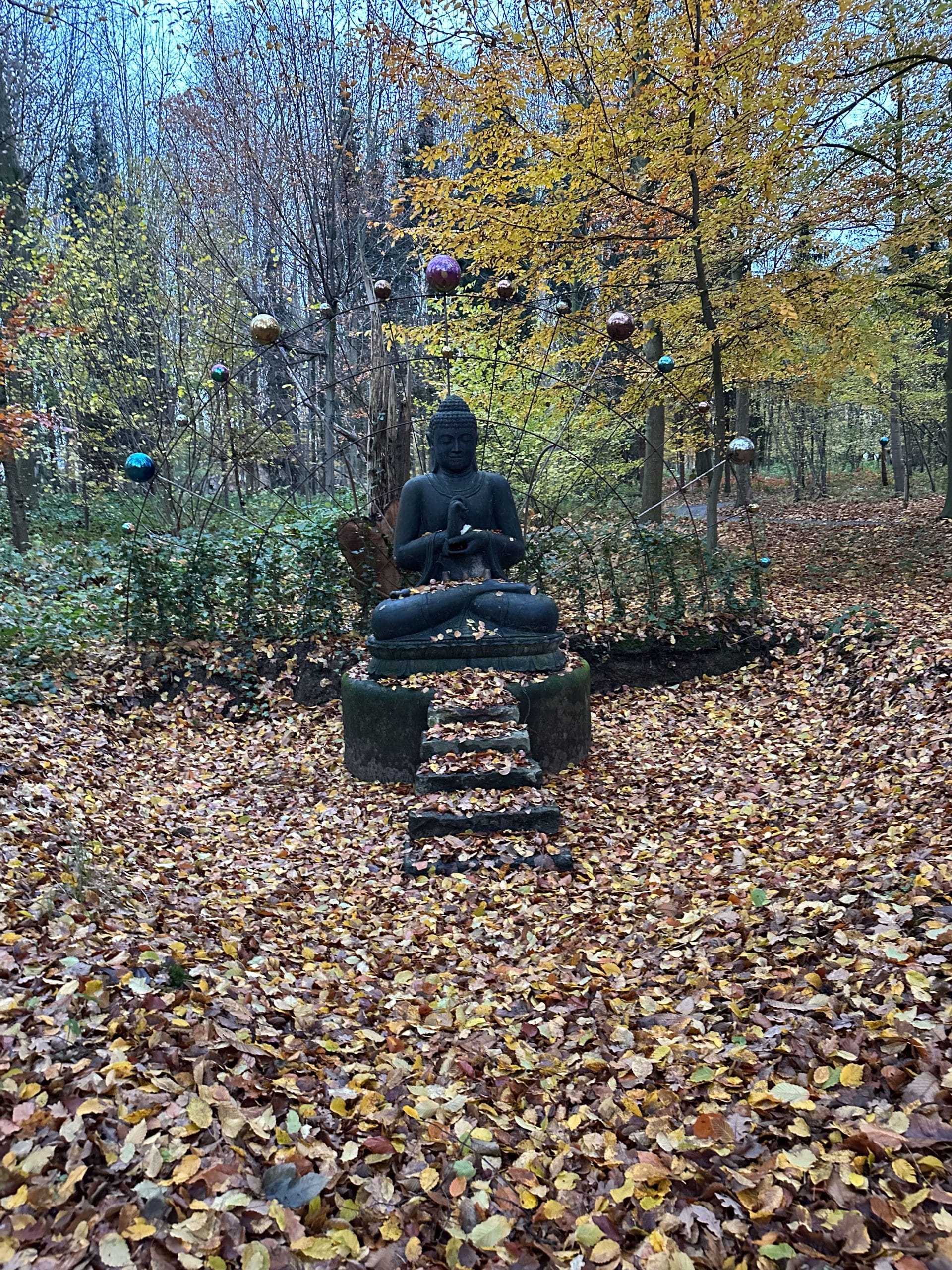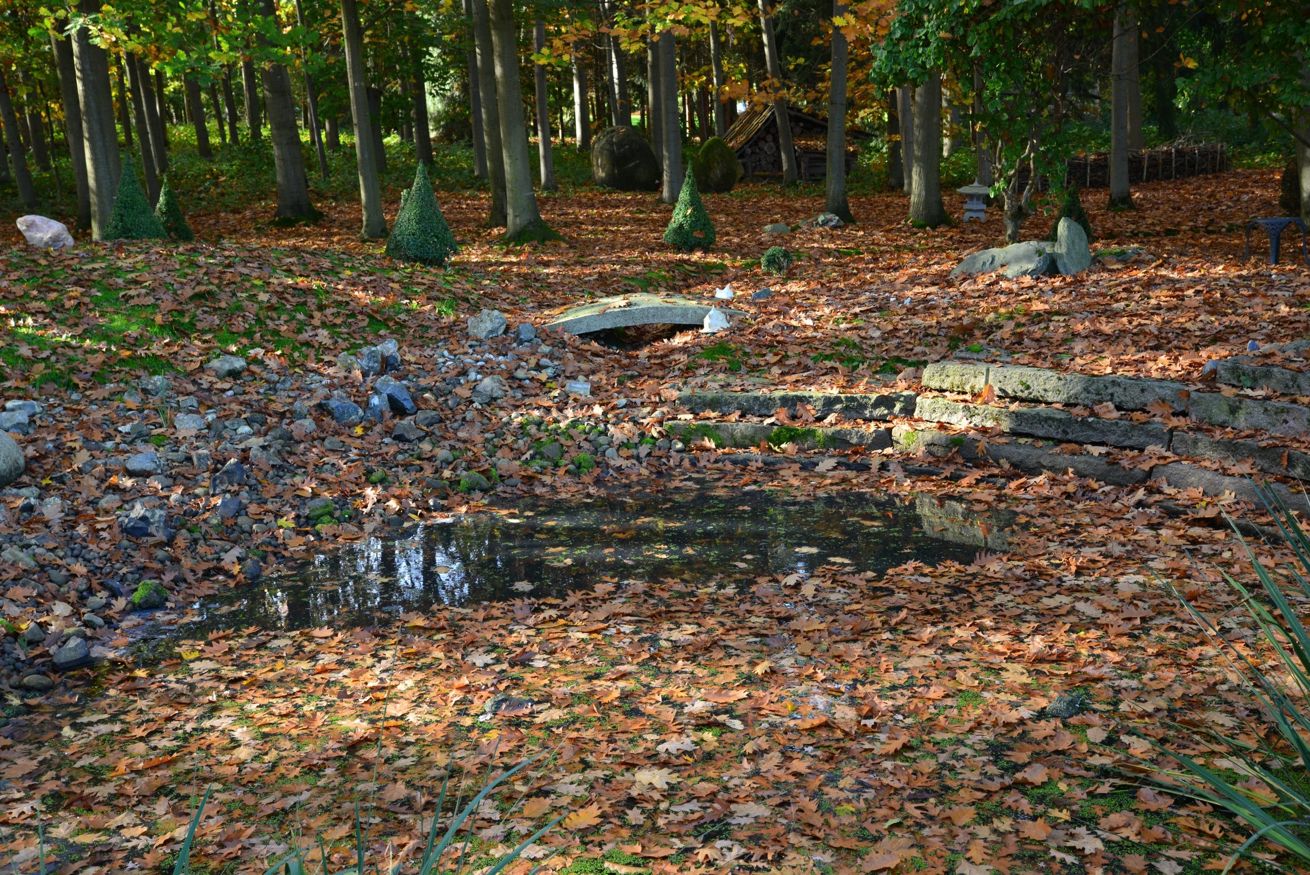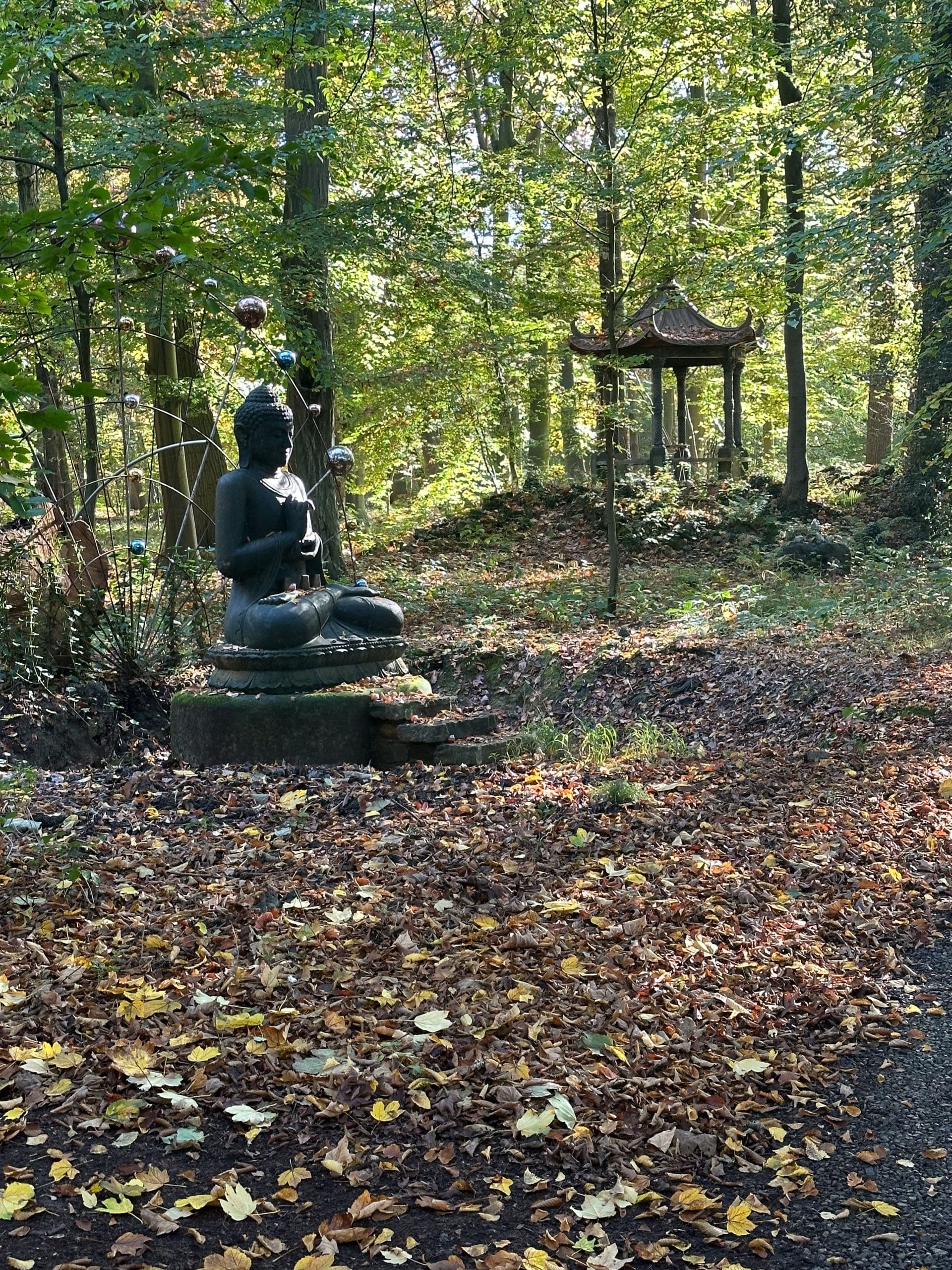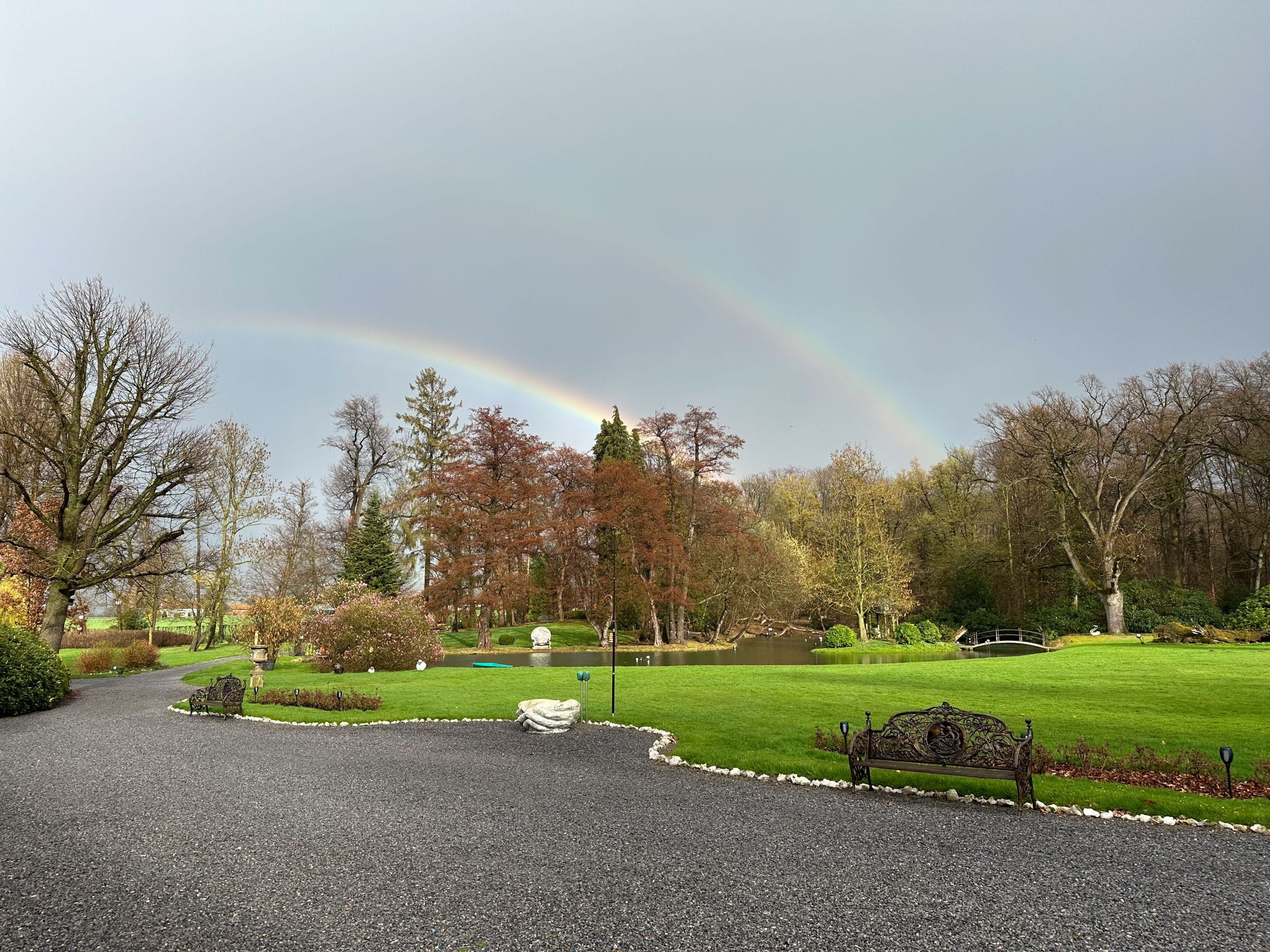 Soms is er nog een mooie dag en kan er in het prieel aan het water even in de gekleurde stoeltjes worden gezeten of op het bankje op een heuveltje in het Chinese prieel.
